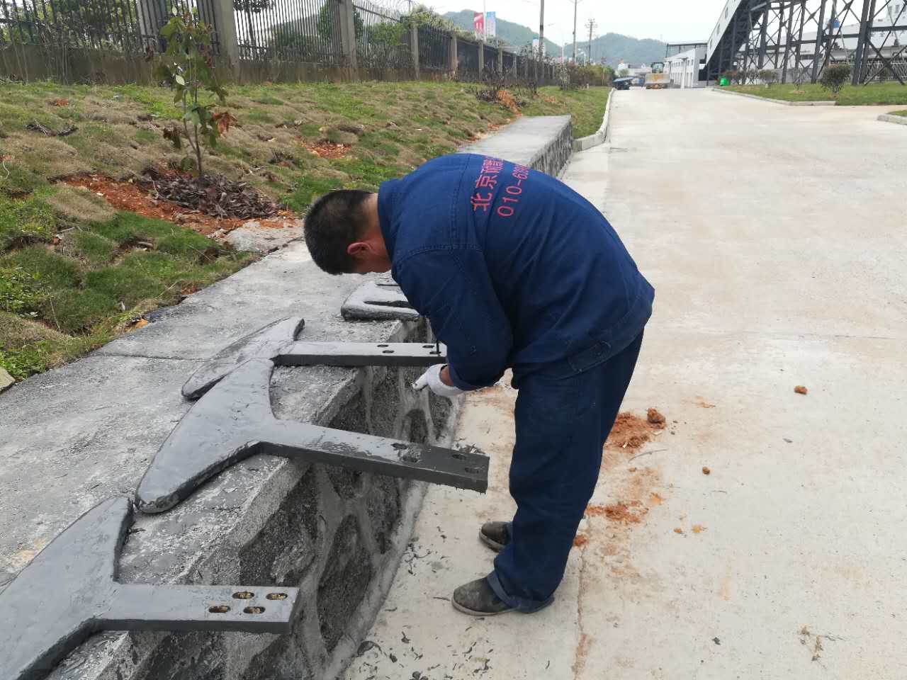 圖(3)正在現場檢測耐磨陶瓷涂層膠的施工質量