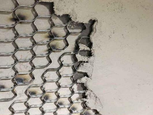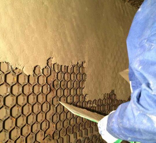 2.1根據(jù)煙道實(shí)際尺寸,先將金屬網(wǎng)裁剪好。焊接時(shí),將網(wǎng)緊緊貼靠管壁表面,并用木棍將網(wǎng)頂緊,不能留有空檔及間隙。然后采用點(diǎn)焊方法焊接龜甲網(wǎng),間距為100×100mm。焊接牢固,不能有松動(dòng)或向外拱起彈動(dòng)現(xiàn)象,以確保襯里材料涂抹上去后密實(shí)牢固。